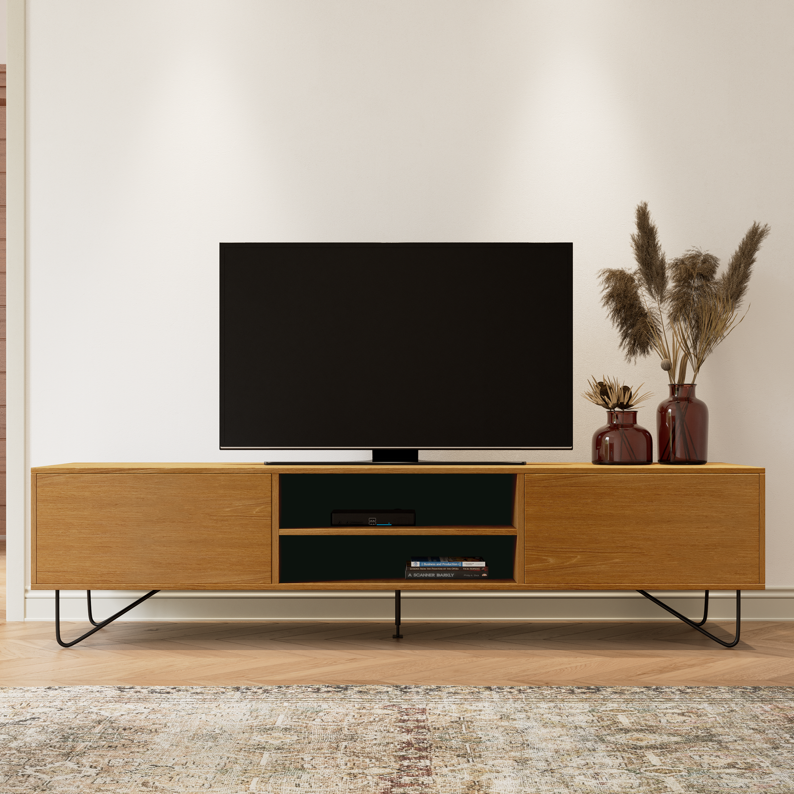 We paid close attention when we asked you how your desired TV cabinet should look. It should be made of oak; it should have space for all the remotes and gaming consoles and the legs should be sleek. Please let us introduce you to our Khaya TV cabinet. With gorgeous, oak paneling and storage space to spare, the Khaya TV cabinet is ready to be at the center of your space's attention. It has two flip down drawers to keep the items you do not want to see and it has an open middle console for all your gaming and TV equipment.